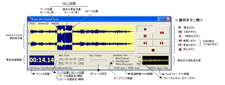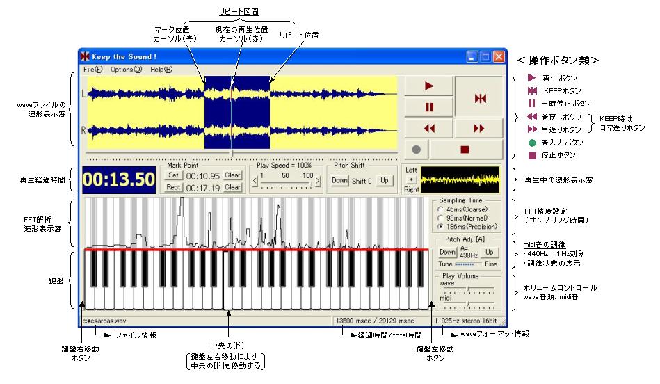 操作はシンプルで、直感的にわかりやすいよう工夫しています。ショートカットキーを活用すればストレスなく音楽解析に集中できます。 ※ "KEEP"機能は、一時停止した時点前後の極めて短時間(0.04秒〜0.2秒間)の音を切り出して、繰り返し(ループ)再生することによって実現しています。(特許登録済み)