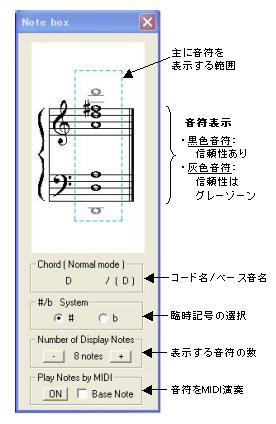 ( 黒色の音符は確度の高いもの、灰色の音符は確度が低いことを示します ) 本ソフトに添付の sample.wav を例題にして、楽譜ボックスの使い方、耳コピのやり方などをこちらで解説しています。